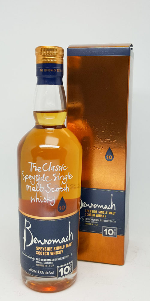 Whisky BENROMACH 10Y zrála v sudech po bourbonu a sherry. Delikátně rašelinová a kouřová s jemnou chutí po sherry a dlouhým koncem.
